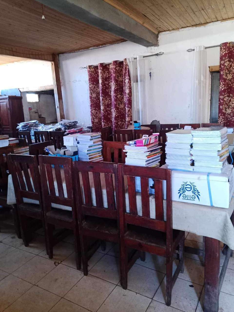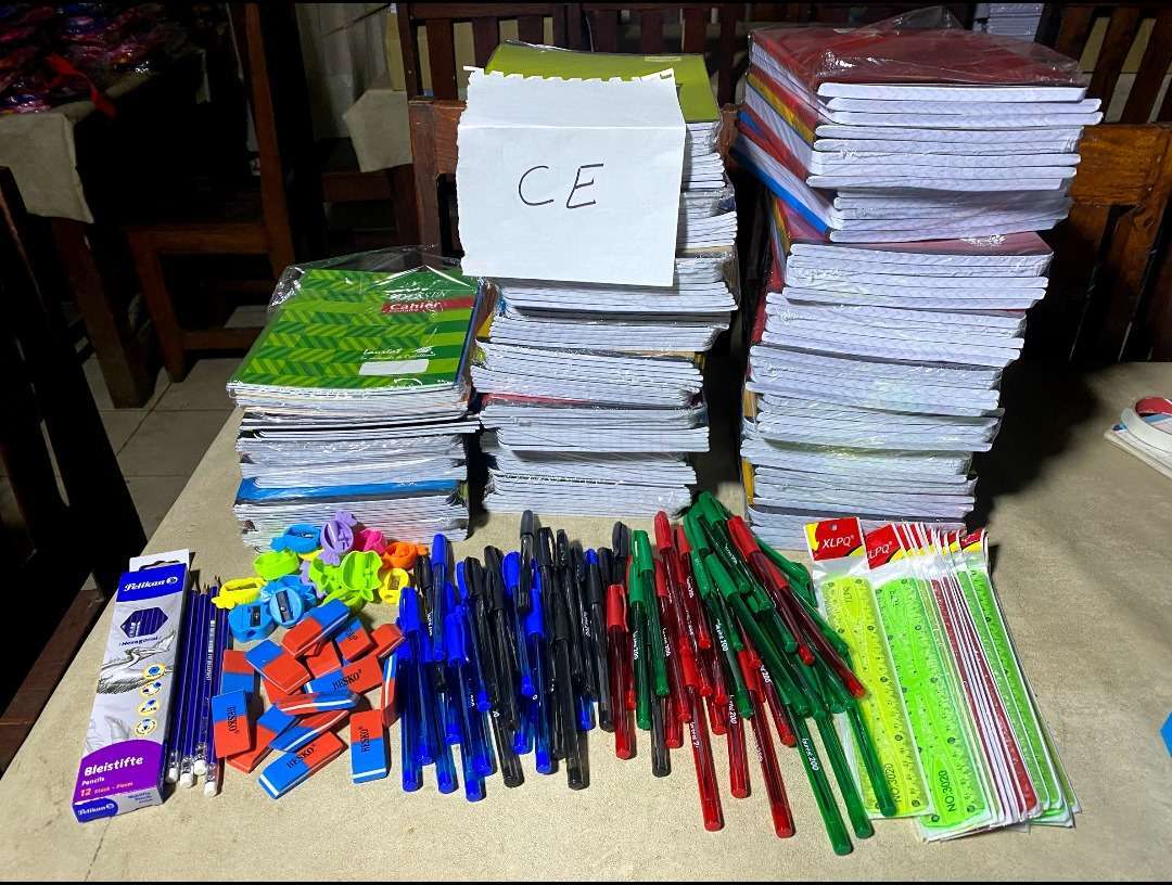 All Joër fir d’Schoulrentrée finanzéiert eis Asbl all de Schüler aus de 4 Schoulen (ronn 1000 Schüler) d’Schoulmaterial. Dobäi kommen och all Joërs Rucksäck, Sportsmaterial…, déi fir d’Schüler an d’Schoule gebraucht ginn. Des Finanzéierung ass fir d’Elteren eng ganz grouss finanziell Entlaaschtung. Sou geléngt et de Famillen, trotz hirer Aarmutt (duerchschnëttlecht Dagesakommes: 1-2 EURO) méi Kanner pro Famill an d’Schoul ze schécken. D’Direktiounen vun de Schoulen kafen all d’Material bei engem Grousshändler an der Haaptstaadt an. Eis Asbl ënnerstëtzt duerch des Virgehensweis de lokalen Handel.