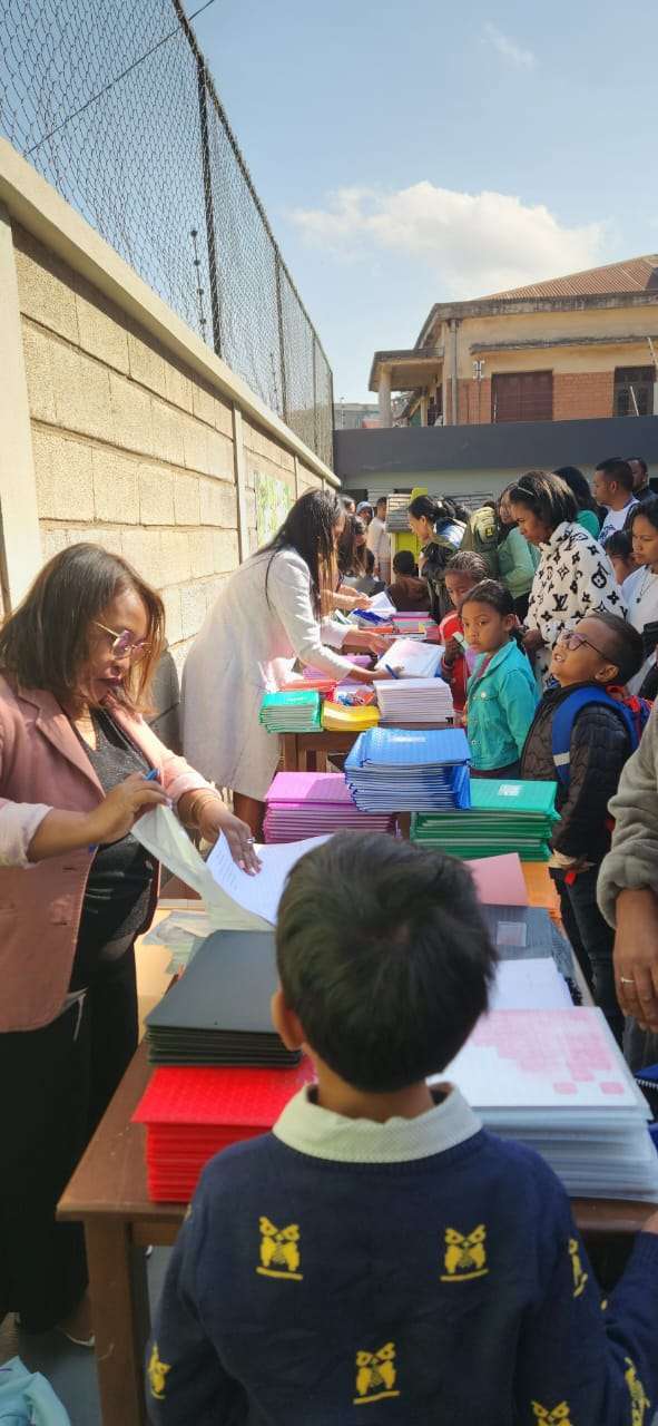 All Joër fir d’Schoulrentrée finanzéiert eis Asbl all de Schüler aus de 4 Schoulen (ronn 1000 Schüler) d’Schoulmaterial. Dobäi kommen och all Joërs Rucksäck, Sportsmaterial…, déi fir d’Schüler an d’Schoule gebraucht ginn. Des Finanzéierung ass fir d’Elteren eng ganz grouss finanziell Entlaaschtung. Sou geléngt et de Famillen, trotz hirer Aarmutt (duerchschnëttlecht Dagesakommes: 1-2 EURO) méi Kanner pro Famill an d’Schoul ze schécken. D’Direktiounen vun de Schoulen kafen all d’Material bei engem Grousshändler an der Haaptstaadt an. Eis Asbl ënnerstëtzt duerch des Virgehensweis de lokalen Handel.